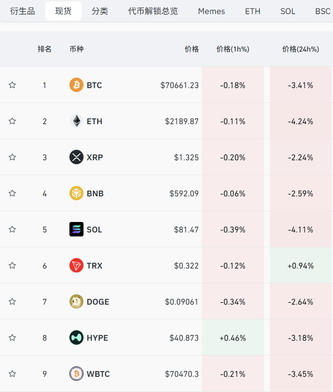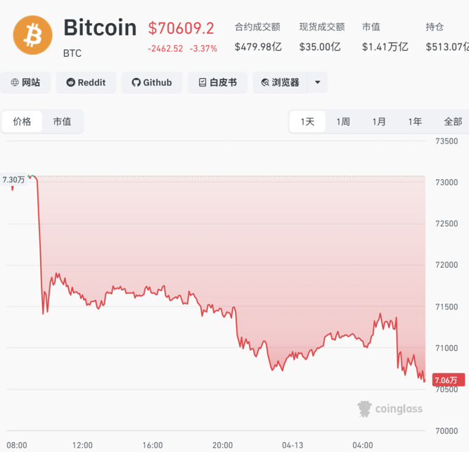 4月13日早间,比特币价格再度走低,日内一度跌至70500美元附近。截至发稿,比特币价格约为70600美元。