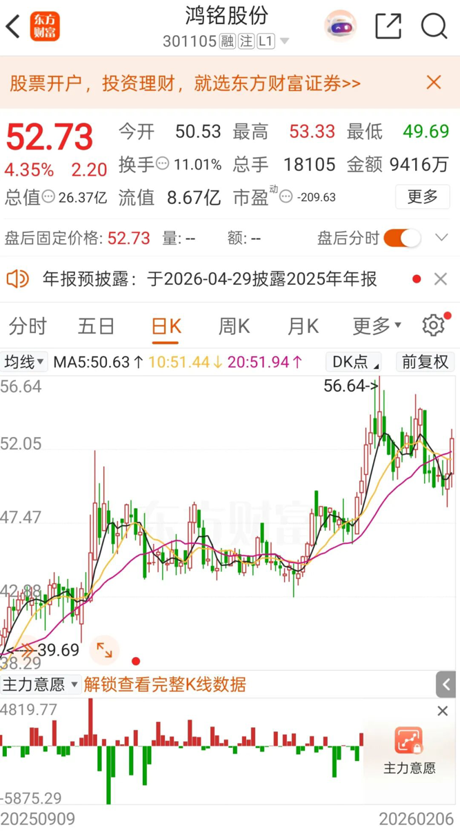 截至2月6日收盘,鸿铭股份报52.73元/股,上涨4.35%,总市值为26.37亿元。