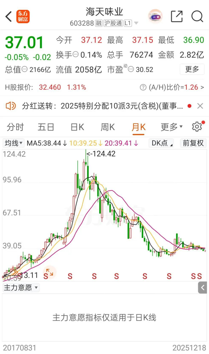 截至12月18日,海天味业A股报37.01元/股,总市值为2166亿元。