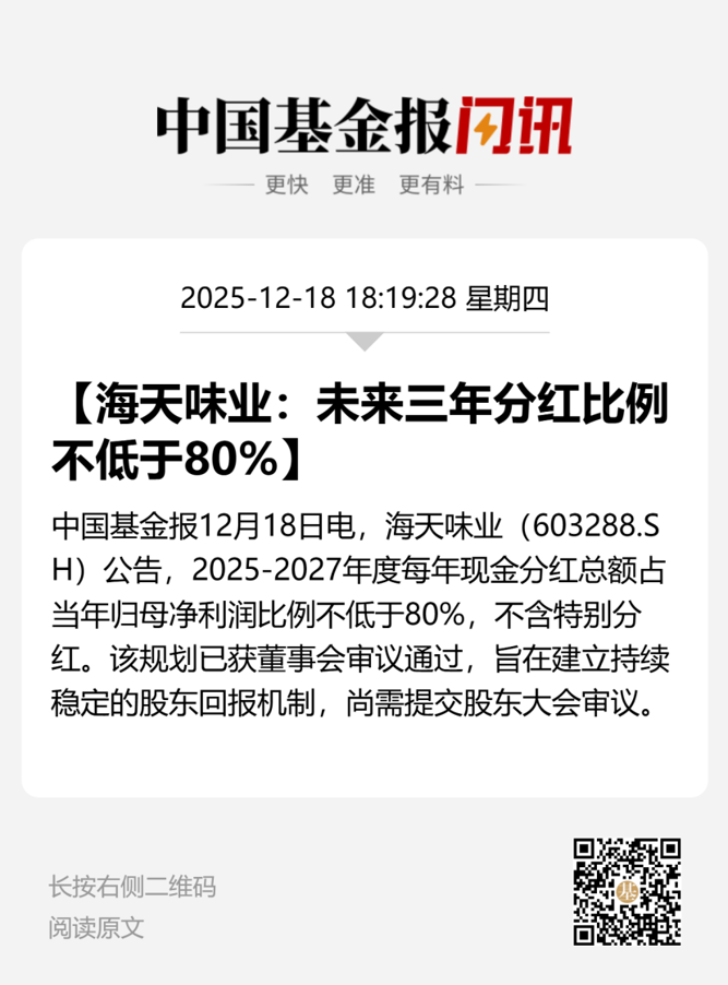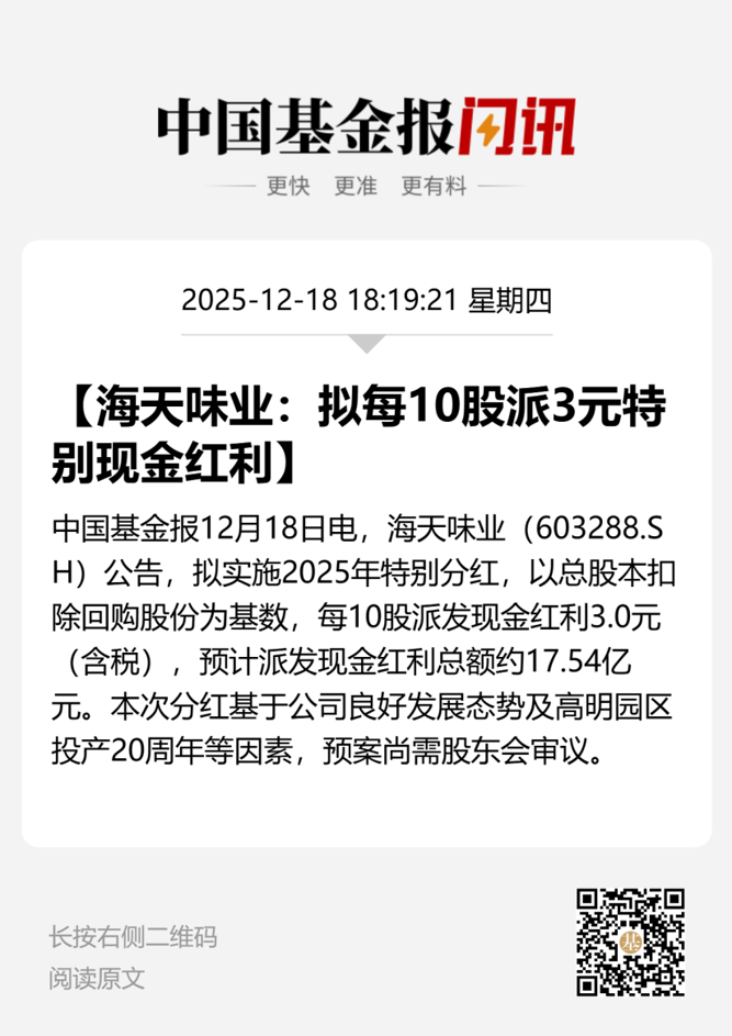 12月18日晚间,海天味业发布公告称,拟实施2025年特别分红,向全体股东每10股派发现金红利3元(含税),合计拟派发现金红利17.54亿元(含税)。