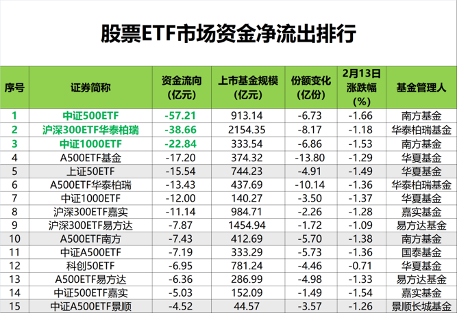 Wind数据显示,截至2月13日,全市场1339只股票ETF(含跨境ETF)总规模达4.12万亿元。在股市下跌行情中,股票ETF市场净流出资金达194.75亿元。