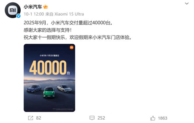 10月1日,小米汽车发布微博宣布,2025年9月,小米汽车交付量超过40000台。