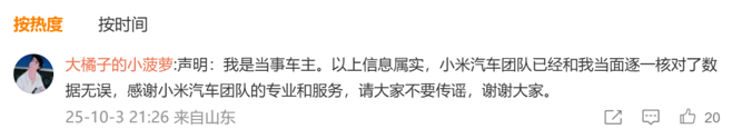 另外,在小米发言人该条微博下方,当事车主现身留言称:“以上信息属实,小米汽车团队已经和我当面逐一核对了数据无误,感谢小米汽车团队的专业和服务,请大家不要传谣,谢谢大家。”