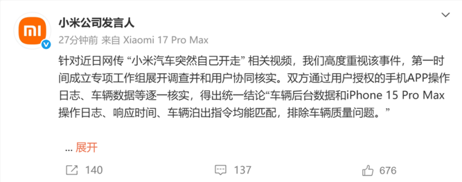 小米表示,针对近日网传“小米汽车突然自己开走”相关视频,公司高度重视该事件,第一时间成立专项工作组展开调查并和用户协同核实。双方通过用户授权的手机App操作日志、车辆数据等逐一核实,得出统一结论“车辆后台数据和iPhone 15 Pro Max操作日志、响应时间、车辆泊出指令均能匹配,排除车辆质量问题。”