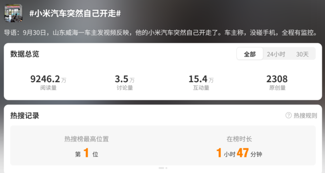 10月2日,“小米汽车突然自己开走”的词条登上微博热搜榜首位。据山东威海一车主发视频反映,他的小米汽车突然“自己开走了”,“没碰手机,全程有监控”。