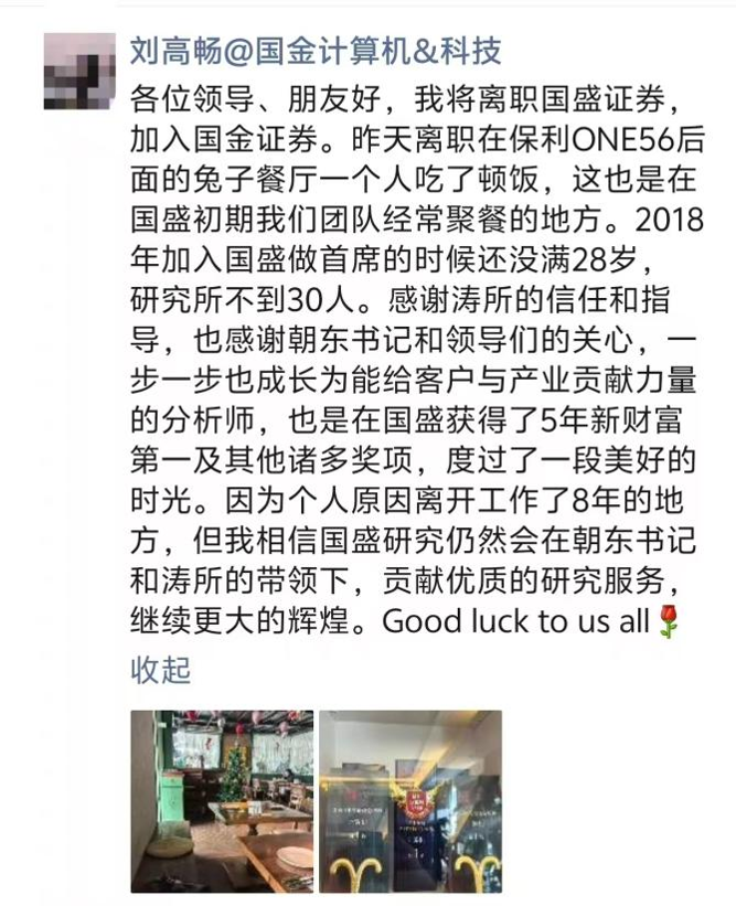 12月26日,刘高畅在朋友圈官宣将离职国盛证券,加入国金证券,并表示是因为个人原因离开工作了8年的地方。
