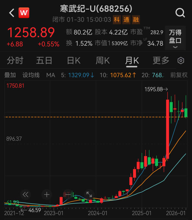 1月30日,寒武纪-U报收于1258.89元/股,最新市值为5309亿元。