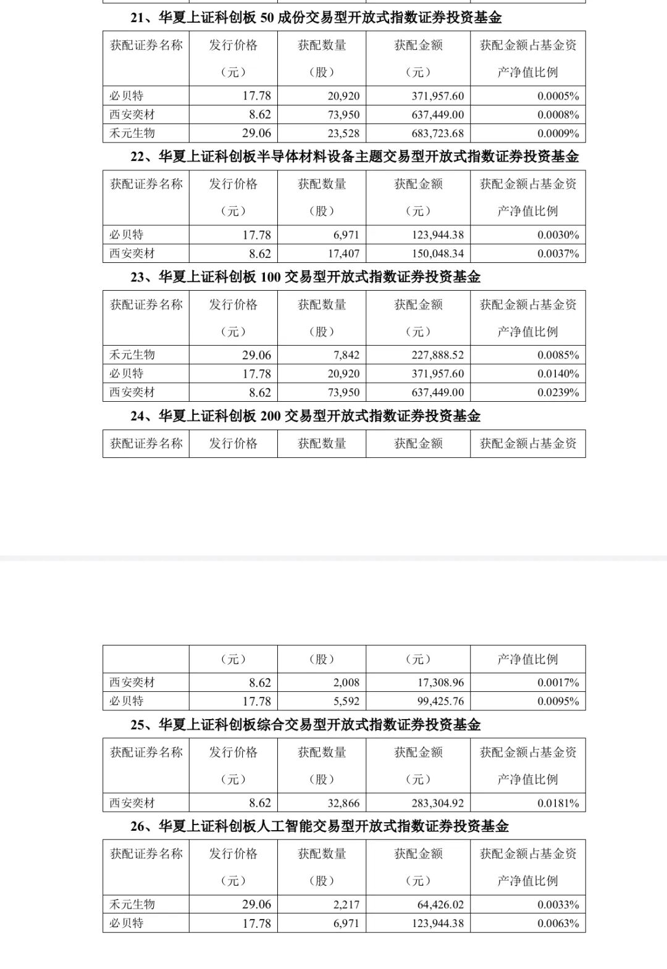 Wind数据显示,除了华夏基金旗下产品之外,还有包括南方中证500ETF、万家中证A500ETF、富国中证A500ETF、华泰柏瑞沪深300ETF等在内的超160只ETF及联接基金参与了和元生物的网下配售;超200只ETF及联接基金参与了西安奕材网下配售;超250只ETF及联接基金参与了必贝特的网下配售。
