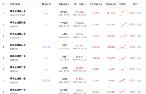 第三方的私募数据显示,瑞丰达的产品净值非常漂亮,几乎没有回撤,年化收益率基本上20%起步。旗下有个产品收益795.43%,年化收益高达191.25%。