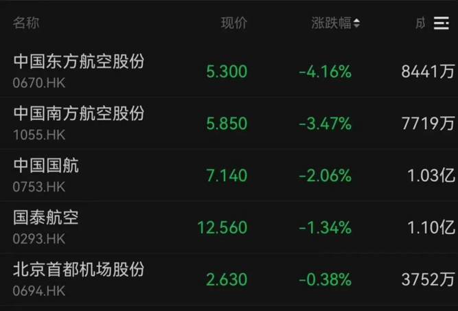三大航空公司东方航空、南方航空、中国国航分别收跌4.16%、3.47%、2.06%。