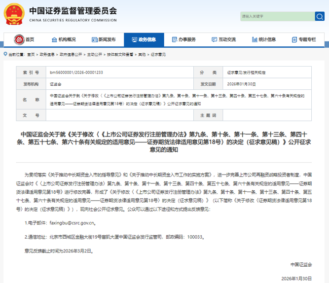 为贯彻落实《关于推动中长期资金入市的指导意见》和《关于推动中长期资金入市工作的实施方案》,进一步完善上市公司再融资战略投资者制度,1月30日,中国证监会就《关于修改〈《上市公司证券发行注册管理办法》第九条、第十条、第十一条、第十三条、第四十条、第五十七条、第六十条有关规定的适用意见——证券期货法律适用意见第18号〉的决定(征求意见稿)》(以下简称《法律适用意见》)公开征求意见。