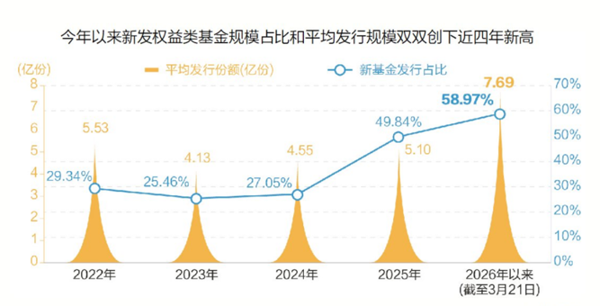Wind数据显示,截至3月21日,今年以来新发权益类基金规模达1737.18亿元,在新发基金中的占比达58.97%,平均发行规模为7.69亿份,双双创下近四年新高。