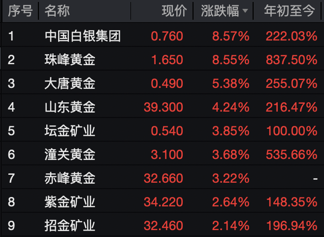 港股贵金属板块延续涨势,中国白银集团一度涨超26%,紫金黄金国际、大唐黄金、山东黄金、潼关黄金等涨幅居前。