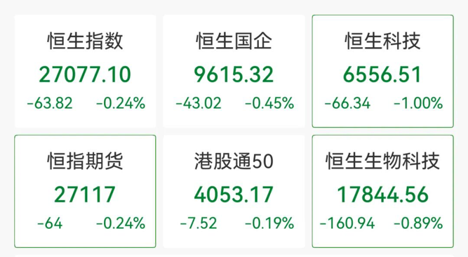 截至发稿,恒生指数跌0.24%,恒生科技指数跌1%。