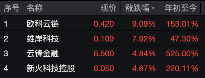 港股加密货币概念股上涨,欧科云链涨超9%,雄岸科技涨近8%,新火科技控股、云锋金融涨超4%。