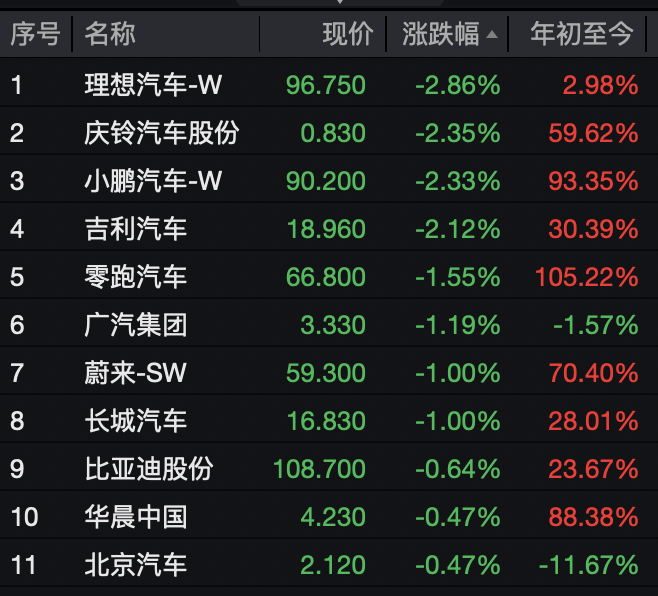 港股汽车股开盘走弱,小鹏汽车一度跌4%,理想汽车跌近3%,蔚来汽车跌超1%。