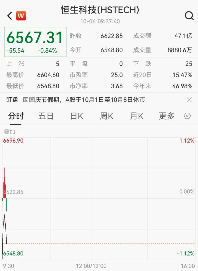 10月6日,港股三大指数开盘走弱,恒生指数开跌0.5%,恒生科技指数开跌1.1%。