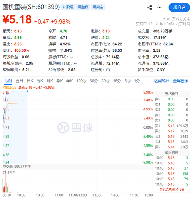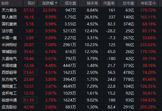 核聚变概念股走强,雪人集团、国机重装、法尔胜、中国一重均直线拉涨停。