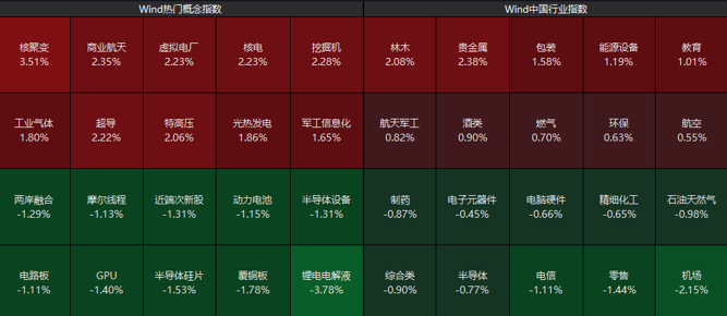 从板块上看,核聚变概念股走强,虚拟电厂、商业航天、贵金属等板块表现活跃;锂电电解液板块显著下挫,摩尔线程早盘大幅走低,GPU、半导体等板块震荡调整。