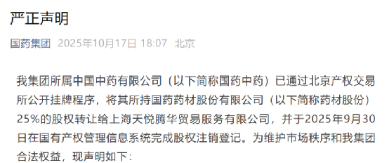 国药集团称,集团所属中国中药有限公司(以下简称国药中药)已通过北京产权交易所公开挂牌程序,将其所持国药药材股份有限公司(以下简称药材股份)25%的股权转让给上海天悦腾华贸易服务有限公司,并于2025年9月30日在国有产权管理信息系统完成股权注销登记。