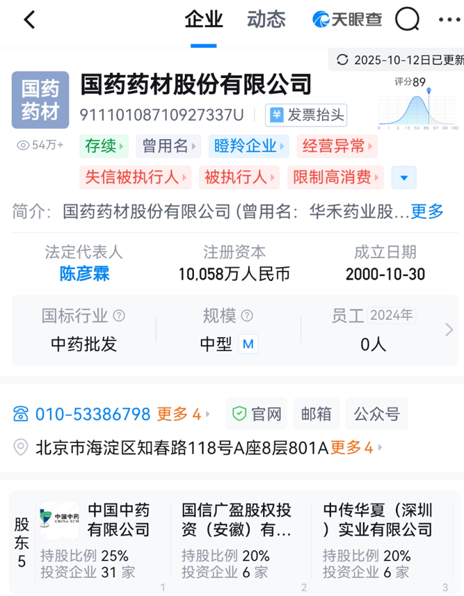 天眼查信息显示,国药药材股份有限公司原名华禾药业股份有限公司,公司成立于2000年,注册资本为10058万元。目前,药材股份存在经营异常、失信被执行人、限制高消费等多个负面标签,且2023年、2024年参保员工均登记为0人。