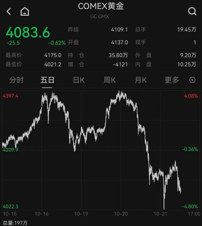 10月21日,国际贵金属价格大幅“跳水”,COMEX黄金指数单日跌幅为5.39%;22日,COMEX黄金指数盘中最低触及约4020美元/盎司。