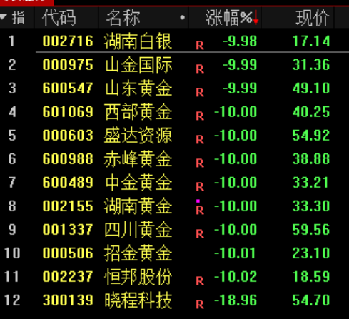 下跌方面,资源股集体调整,贵金属、油气方向领跌,中金黄金、四川黄金、准油股份等多股跌停。