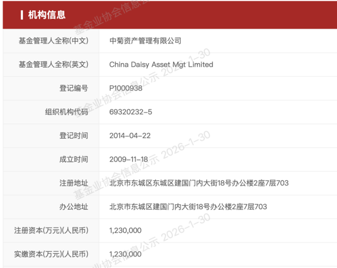结合天眼查、中基协官网信息来看,中菊资产成立于2009年11月,注册及实缴资本高达123亿元。公司前身“菊华信用担保有限公司”,2013年7月正式变更,经营范围也从主要“为中小企业提供贷款、融资租赁及其他经济合同担保;个人消费贷款担保;汽车消费信贷担保”,变更为“资产管理”。