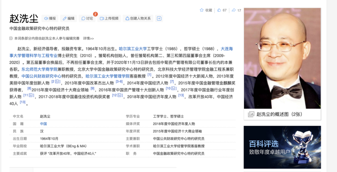 中菊资产前法定代表人、实控人赵洗尘曾参与编辑了自己的百度百科词条,标明了他在金融领域获得的多个称号,包括:2012年度中国经济十大新闻人物,2013年度美丽中国年度创新人物,2013年度中国改革杰出人物,2014年度中国经济人物等。