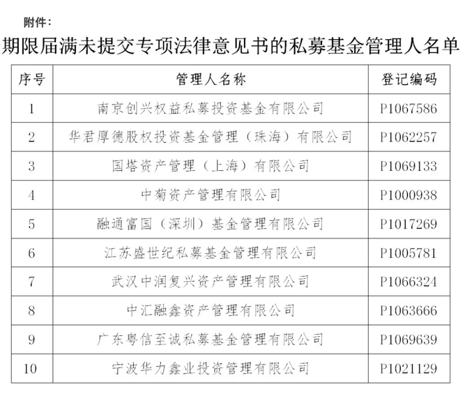 根据中基协公告,南京创兴权益私募投资基金有限公司等10家私募基金管理人存在异常经营情形,且未能在书面通知发出后的3个月内提交符合规定的专项法律意见书,协会将注销该10家机构的私募基金管理人登记。