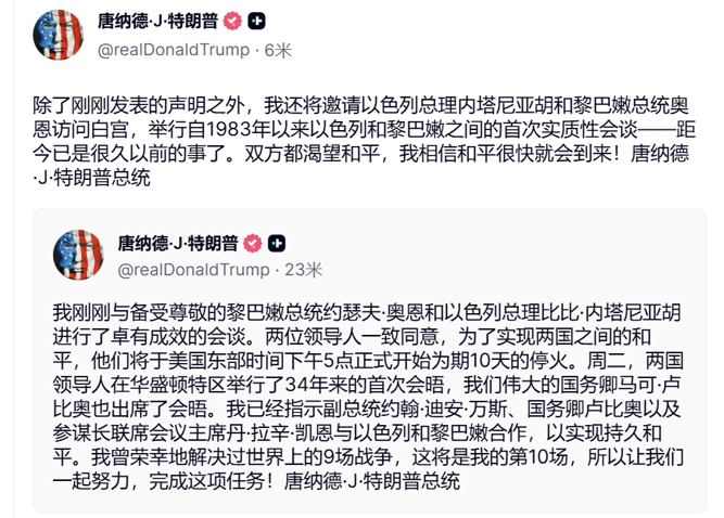 特朗普在社交媒体上表示,两国将于纽约时间下午5点开始停火。特朗普还指示副总统万斯、国务卿以及参谋长联席会议主席,“与以色列和黎巴嫩合作,以实现持久和平”。