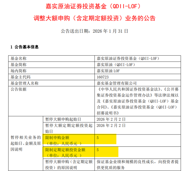 当晚,嘉实原油LOF也公告称,自2月2日起暂停大额申购、大额定期定额投资业务,每日累计投资限额不超过5元。该基金在1月29日曾宣布,自3月18日起单个开放日每个基金账户的累计申购(含定期定额投资)金额不得超过100元。仅仅过了一天,又再度加大限购力度。