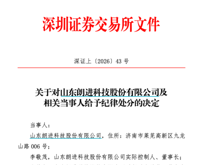 同日,公司及相关责任人还收到深交所《关于对山东朗进科技股份有限公司及相关当事人给予纪律处分的决定》,其中,对朗进科技给予公开谴责的处分,对李敬茂、邱若龙、李敬恩给予公开谴责的处分,对王绅宇、王智鑫给予通报批评的处分。