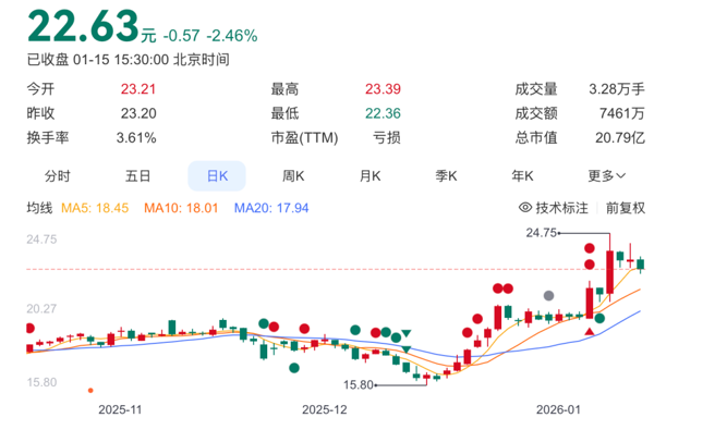 截至1月15日收盘,朗进科技报22.63元/股,下跌2.46%,总市值为20.79亿元。