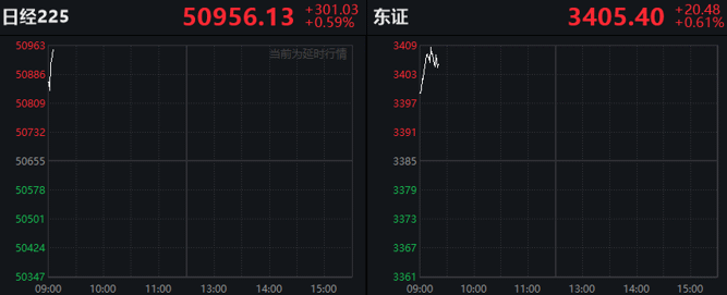 12月10日,日本股市高开高走,日本东证指数涨幅扩大至0.6%,报3405.4点,刷新历史新高。截至发稿,日经225指数涨0.59%,报50956.13点。