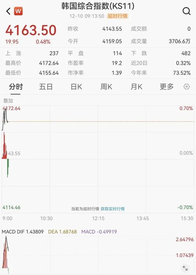 12月10日,韩国股市高开后震荡调整,韩国综合指数涨0.48%,报4163.50点。