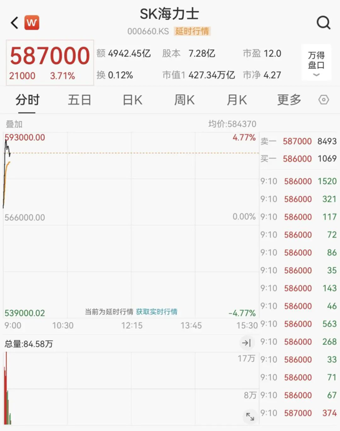 个股方面,SK海力士开盘直线拉升,一度涨超4%,最新市值为427.34万亿韩元。