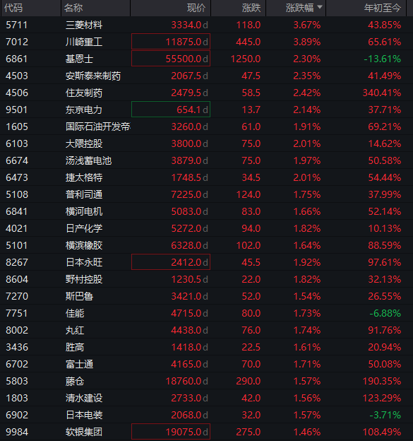 个股方面,三菱材料、川崎重工、住友制药等涨幅居前,软银集团涨超1%。