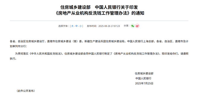 8月26日,住房城乡建设部官网显示,住房城乡建设部、中国人民银行联合印发《房地产从业机构反洗钱工作管理办法》(以下简称《办法》)。