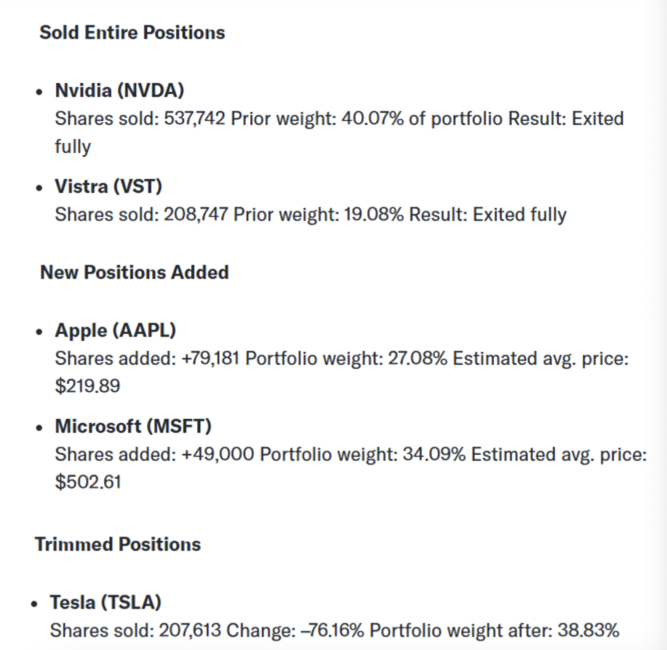 在大幅减持英伟达时,基金大手笔建仓了微软和苹果公司。文件显示,基金在第三季度新建仓买入了49000股微软股票和79181股苹果股票。