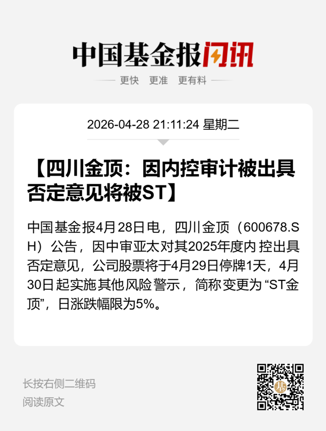 【导读】四川金顶将被实施其他风险警示,2025年度内控被出具否定意见