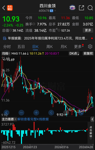 四川金顶计划自4月29日起停牌一日。截至4月28日收盘,四川金顶股价报10.93元/股,跌幅达2.24%,总市值为38.14亿元。