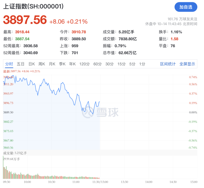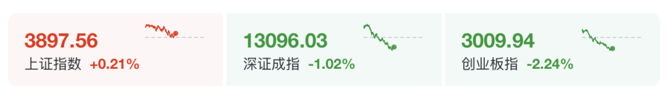 截至午间收盘,沪指报3897.56点,涨0.21%,深证成指跌1.02%,创业板指跌2.24%。