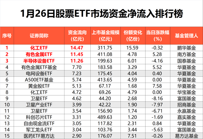 产品维度方面,昨日化工ETF净流入14.47亿元,位居全市场首位。有色金属ETF、半导体设备ETF净流入也超10亿元,位居全市场前三强。