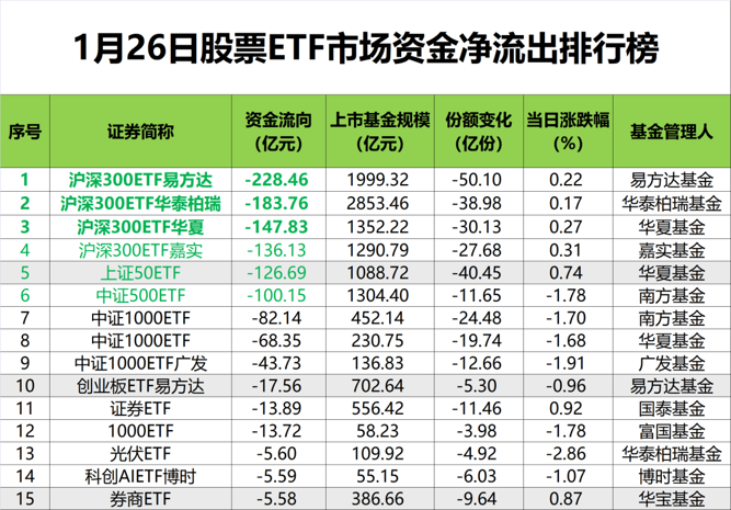 宽基ETF中,上证50ETF、中证500ETF净流出也超100亿元,南方、华夏、广发、富国基金旗下中证1000ETF合计净流出超200亿元。