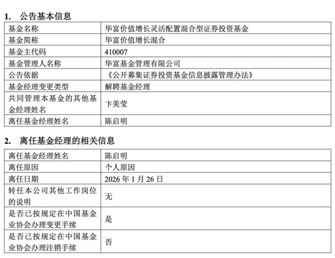1月27日,华富基金旗下华富价值增长灵活配置混合、华富成长企业精选股票、华富卓越成长一年持有期混合、华富成长趋势混合接连发布基金经理变更公告,陈启明因个人原因于2026年1月26日离任上述基金的基金经理。
