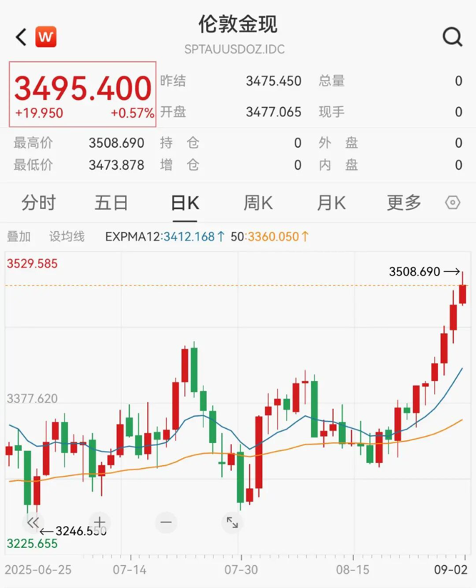 9月2日盘中,伦敦现货黄金价格最高一度升至3508.69美元/盎司,COMEX黄金期货价格最高涨至3578.4美元/盎司,续刷历史新高。截至发稿,国际金价略有回调。