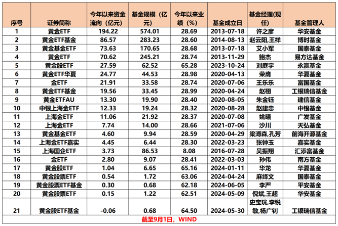 从资金流向来看,截至9月1日,黄金主题ETF今年以来资金净流入580.82亿元,规模合计1645.19亿元,较去年年末的725.88亿元增长超126%。其中,华安黄金ETF年内资金净流入高达194.22亿元,目前规模达574.01亿元,较去年末已经翻倍。此外,博时黄金ETF、国泰黄金基金ETF、易方达黄金ETF也成为“吸金”大户,今年以来净流入资金在70亿元~87亿元区间不等。
