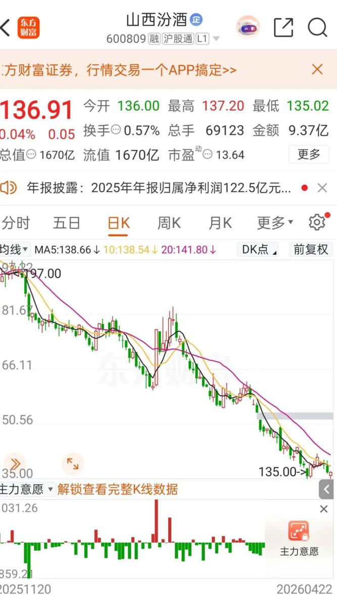 截至4月22日收盘,山西汾酒报136.91元/股,上涨0.04%,总市值为1670亿元。