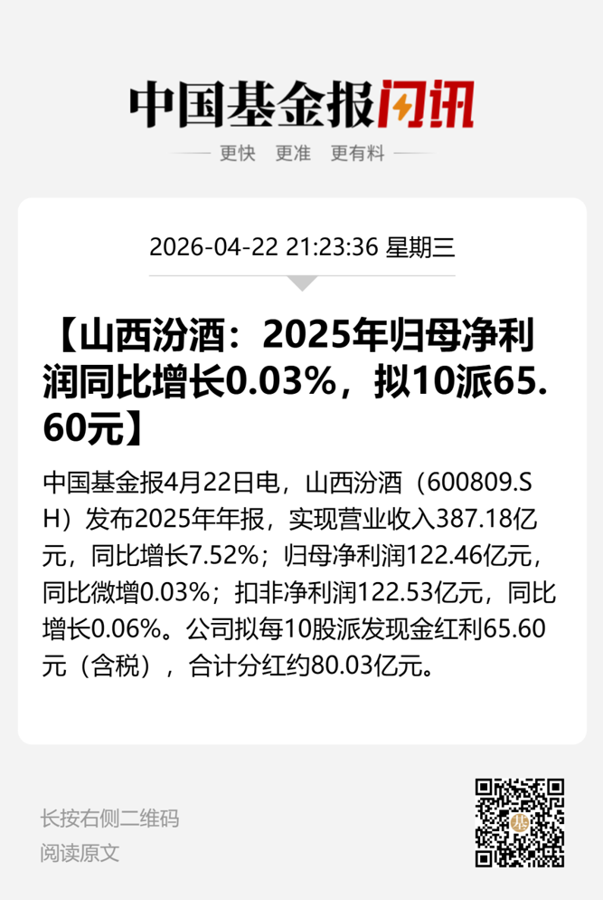4月22日晚间,山西汾酒(证券代码:600809)披露2025年年报。在白酒行业深度调整、多家企业业绩下滑的情况下,公司实现营收、净利双增长,成为目前已披露2025年业绩的白酒企业中唯一保持增长的公司。同时,山西汾酒推出“10派65.6元”的2025年度分红方案,彰显股东回馈诚意。